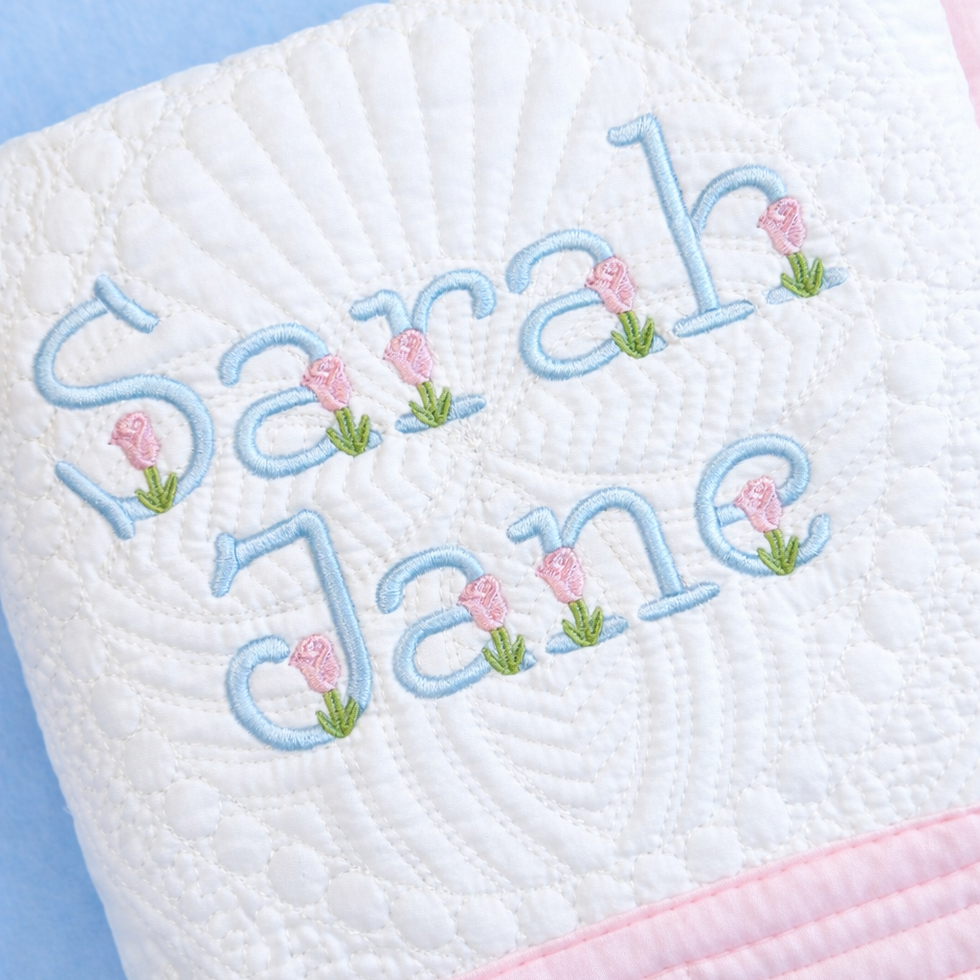 A personalized heirloom style baby quilt makes the perfect baby gift with its scalloped edge and 100% soft cotton. So beautiful you'll want to use it as decor, but so soft you'll want to bundle up your precious little one with it. The quilt measures 46 inches long and 36 inches wide (just the right save for a standard size baby crib.)