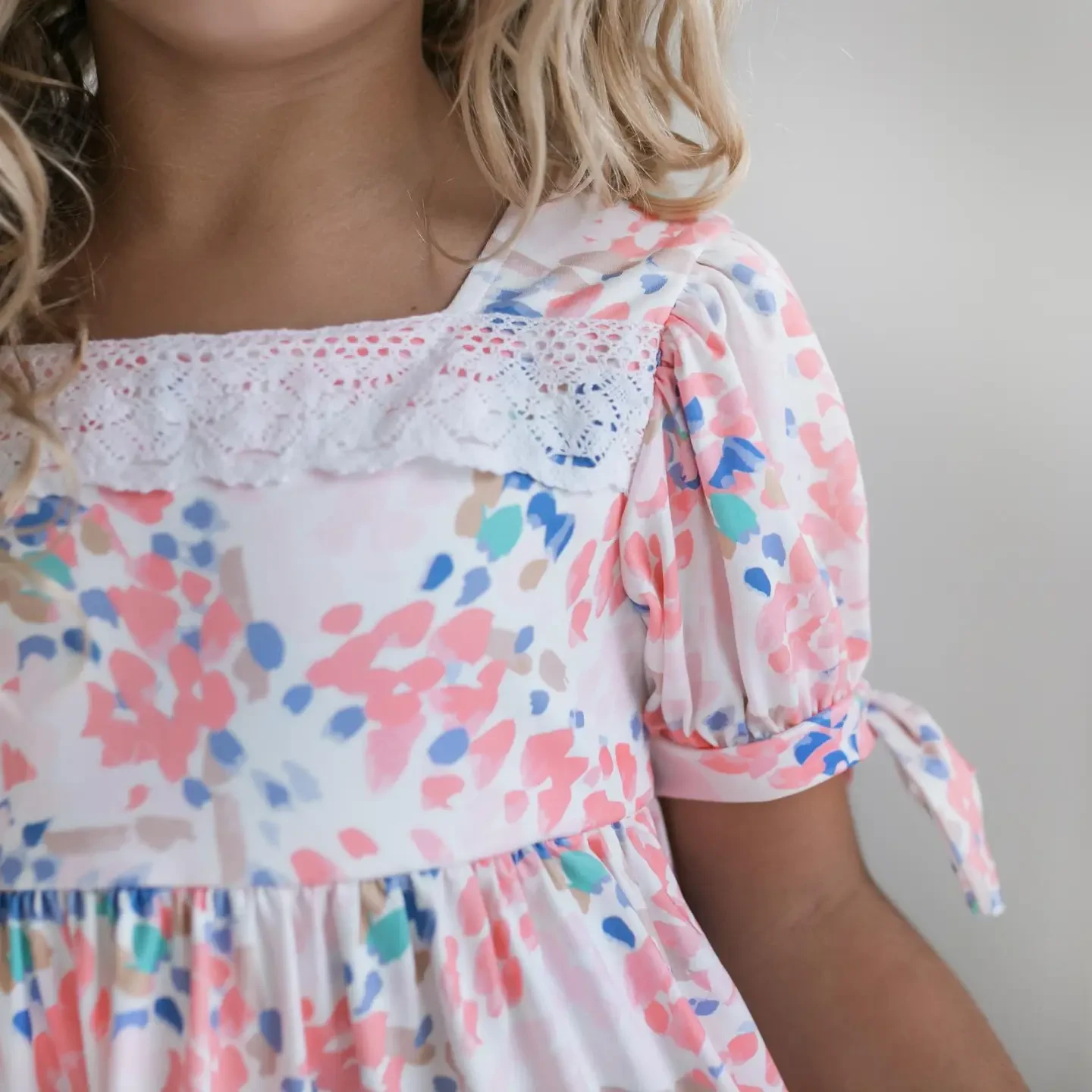 Girls white, pink, and blue tiered square neck dress with lace accents and hem. Short puff sleeves have tie accents. Dress buttons up the back. So cute for spring & summer days! 95% Polyester, 5% Spandex
